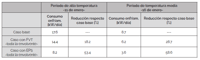 Finalmente, la tercera instancia tiene por objetivo identificar el ahorro energético asociado al uso de las FVT en verano, comparando además su desempeño con el de un aislante tradicional utilizado en el medio local, el poliestireno expandido -EPS-.