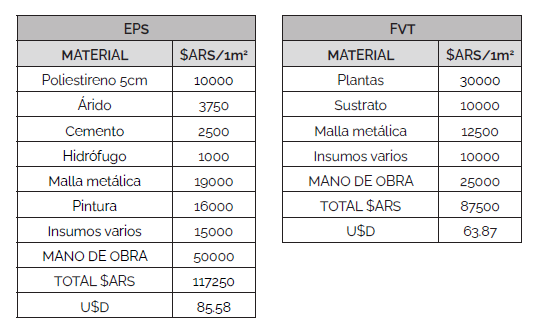 económica requerida para implementar FVT y EPS en un metro cuadrado