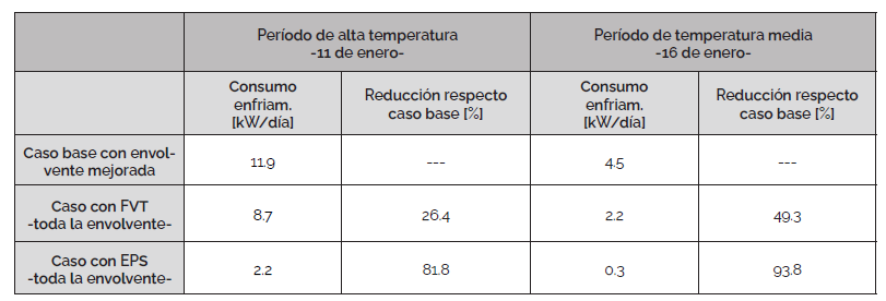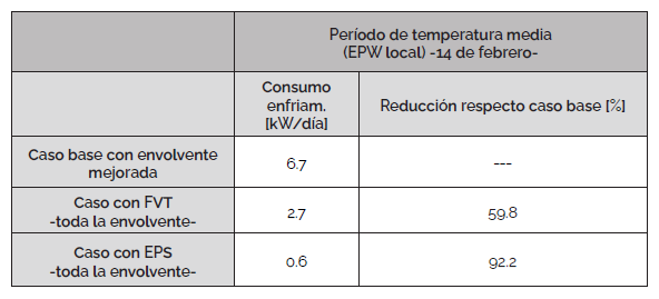 Dado que la envolvente original horizontal -techo- presenta baja calidad energética, perjudicando el potencial de reducción de consumo de energía de la incorporación de estrategias en envolventes verticales, se decide mejorarla para los próximos análisis con 5 cm de EPS. De esta forma, la aplicación de FVT o EPS en la totalidad de los muros verticales expuestos eleva los valores de ahorro, los cuales ascienden a 26.4 % para la implementación de la FVT, mientras que se registra un valor de 81.8 % para el caso de EPS durante el día de temperaturas elevadas. Mientras que los valores registrados durante el día de temperaturas promedio son de 49.3 % para la FVT y de 93.8 % para el caso de EPS . Ver Tabla 4.