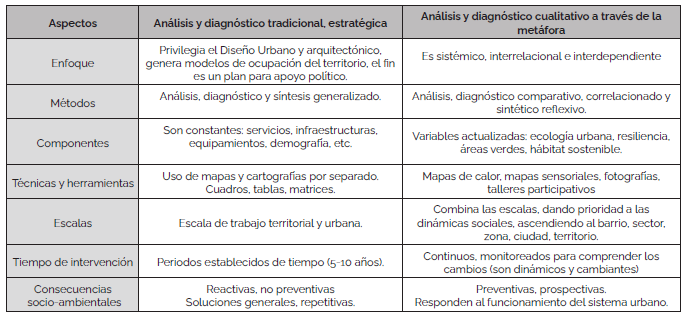 En los diagnósticos urbanos uno de los desafíos es la comprensión de las dinámicas urbanas mediante instrumentos teóricos que nos acerquen a esa realidad (Krieger, 2006). La sistematización y levantamiento de información con la tecnología actual es cada vez más completa, pero en la fase cualitativa es necesario potenciar algunos recursos como la metáfora, la analogía, la representación, la imagen, la historia (Viñan, 2008).