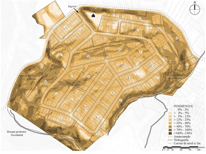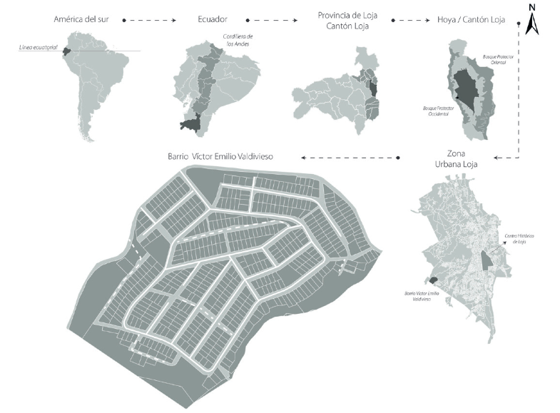 El barrio Víctor Emilio Valdivieso (figura 2), se encuentra junto a áreas de protección de remanentes de hábitats protegidos por el Estado como el bosque protector de la cordillera occidental (Ministerio de Ambiente del Ecuador, 2012). El barrio nace en 1995, la familia de VEV donó un terreno de 15,87 ha. a la Curia de Loja y el acuerdo fue servir a los más pobres. En 1996, tras realizarse la lotización y la apertura vial, se efectúa el sorteo de los predios. Los beneficiarios eran pobladores en extrema pobreza, muchos llegaron a vivir armando con palos y plásticos su vivienda. En estas circunstancias los promotores del proyecto obviaron el análisis técnico de las características del terreno, dándole más énfasis a su intención solidaria que a las condiciones topográficas. Pese a las dificultades de la planificación del proyecto y a la permisividad municipal, cabe recalcar que se diseñaron franjas verdes públicas, algo no común en las urbanizaciones de la ciudad. Entre las consecuencias de obviar los parámetros de la planificación urbana resaltan las dinámicas socio espaciales negativas, y que hoy se traducen en inseguridad en ciertos espacios del barrio afectando la calidad de vida de todos sus habitantes.