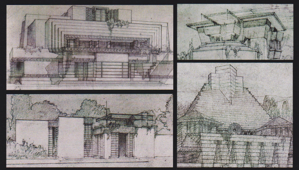 la Casa de la Cascada. Arriba a la izquierda: estudio para Block