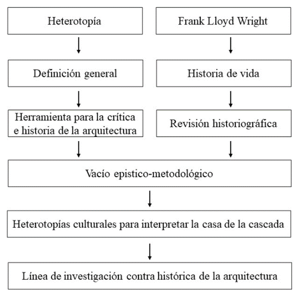 Se empleó un método mixto, arqueológico-hermenéutico (figura 1). En primer lugar, se hizo la recopilación historiográfica de documentos, imágenes y referencias que muestran el profundo impacto de estas culturas en Wright. Posteriormente, se procedió con la interpretación hermenéutica de dichas evidencias desde el concepto de heterotopía de Michel Foucault. Así, este marco filosófico se da a la tarea de excavar los discursos marginados de lo maya y lo japonés como parte indispensable para comprender la genealogía del movimiento moderno. Se comprobará desde esta episteme cómo una obra canónica, como lo es la casa de la Cascada, es el resultado de discursos marginales.