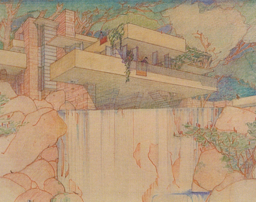 de la Cascada. Perspectiva en escorzo. Wright convierte la terraza en