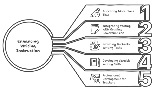 Several teachers emphasized the importance of integrating writing with reading comprehension activities, as well as providing students with authentic, meaningful writing tasks that connect to their interests and real-world experiences. Additionally, some respondents suggested that students should first develop stronger writing skills in Spanish before being expected to produce coherent texts in English. Finally, professional development for teachers was identified as a crucial factor in improving writing instruction, as many educators felt they lacked training in effective writing pedagogy. These opinions are summarized in Figure 1 below.