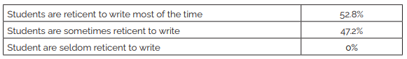 Another limitation is the sole reliance on teachers' self-reported perceptions, which, while valuable, do not provide direct evidence of student writing performance. Teachers' responses reflect their observations and professional insights, but students' perspectives on writing reluctance were not explored. A more comprehensive approach could triangulate data by incorporating student surveys, classroom observations, and analysis of student writing samples to validate and expand upon teachers’ perceptions.