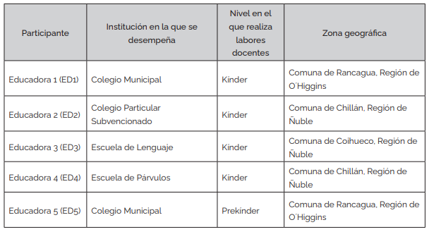 Se entrevistó a cinco educadoras de párvulos que desempeñan acciones de codocencia en un proyecto de ajedrez en el aula, nivel de transición (ver Tabla 2). Dichas docentes, provenientes de tres comunas diferentes, aceptaron participar de manera voluntaria, firmando el consentimiento informado correspondiente. Como la implementación del ajedrez dentro del aula es un aspecto emergente (Aldeán-Riofrío et al., 2022), y en las comunidades educativas no se encuentra masificada la figura del docente especialista en ajedrez, se recurrió a monitores y expertos en la enseñanza de este juego en el rol de codocentes durante la implementación del proyecto Ajedrez en el aula.