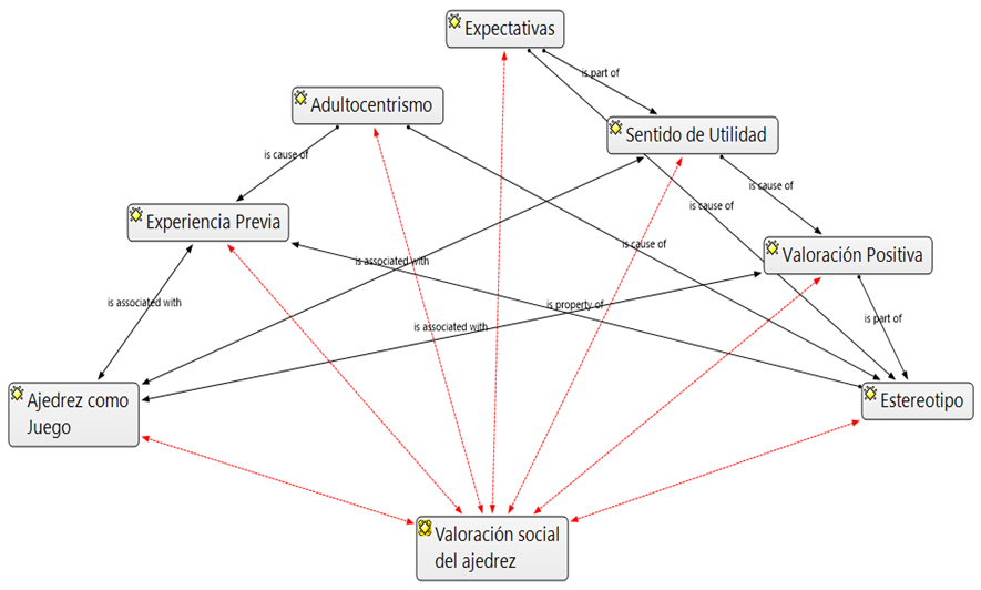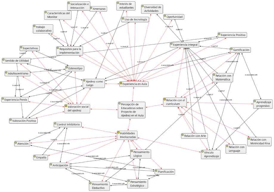 El análisis se basó en el método comparativo constante que forma parte de la Teoría Fundamentada, según la perspectiva de Charmaz (2017). De este modo, se aseguró una estrategia de análisis reglada, sistemática y rigurosa (García, 2023). Se tuvieron en cuenta tres procesos: una codificación abierta, una codificación axial y finalmente una codificación selectiva. Para el proceso de análisis, se recurrió al software Atlas.ti V. 7.5.4. Durante la etapa de codificación abierta, se revisó el corpus y se estableció al menos 115 subcategorías. Una vez concretado este proceso, se inició la codificación axial, definiendo 55 códigos. Luego, se fue realizando la correspondencia y coherencia entre la subcategoría y la cita registrada, combinando o eliminando aquellas en las que no existía vinculación. En la etapa de codificación selectiva, se establecieron relaciones entre las subcategorías que presentaron una mayor saturación, enlazando argumentativamente cada subcategoría hasta que emergieron cuatro categorías robustas que evidencian las percepciones en torno a la implementación del proyecto de ajedrez en el aula (ver Figura 1). El análisis fue realizado a través de redes o mapas conceptuales.