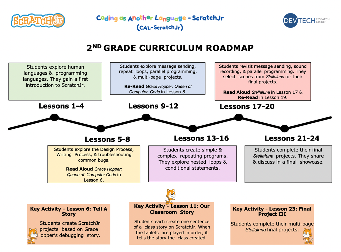 Through twenty-four 45-minute lessons, the CAL curriculum uses the free ScratchJr programming language to engage children in pre-kindergarten, kindergarten, first grade, and second grade in both plugged activities—such as creating interactive projects in ScratchJr—and unplugged activities, including read-alouds, singing, writing journals, and using crafts and recycled materials to practice computer science concepts away from the screen. The curriculum’s structure (Figure 1) progressively introduces new coding concepts, offering multiple opportunities for children to design and code personally meaningful projects, interact with others, and grow socially and emotionally by learning to use a programming language for expressive and communicative purposes (Bers et al., 2023).