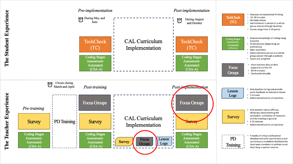 The CAL intervention uses a randomized controlled trial (RCT) design, with teachers and their students randomly assigned to either a control or a treatment group to assess the impact of the intervention. As part of this study, teachers in the treatment group completed a series of validated assessments before, during, and after the training and curriculum implementation. However, for this analysis, we focus solely on the analysis of focus groups conducted during and after implementing the CAL curriculum. This approach allows for a deeper exploration of teachers’ experiences, perspectives, and insights related to the specific aspects of this article (Figure 2).