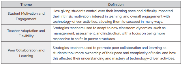 Narrative analysis is the chosen method for understanding the complex accounts of teachers’ negotiation of autonomy while implementing the CAL curriculum (Willis, 2019; Andersen, 2015). The analysis will be organized around three main themes that emerged from the semi-structured protocol used to conduct the interviews: Student Motivation and Engagement, Collaboration and Peer Learning, and Teacher Adaptation and Flexibility (see Table 1). These themes were used to make sense of the recurring patterns and insights across the teachers’ narratives. Through these themes, we can better understand how teachers perceive their roles in the coding classroom during the implementation of the CAL curriculum and the meaning they assign to shifts in power hierarchies. Using pseudonyms to protect teachers’ identities, these narratives will help illuminate the complex and diverse factors influencing teachers' decision-making and adaptive strategies in technology-driven instruction.