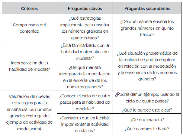 En la Tabla 1 se presentan criterios preliminares para el análisis de la entrevista, además se dan a conocer las preguntas clave y las preguntas secundarias para la realización de la entrevista. Esta organización permite una recopilación de información sistemática, profunda y así asegura que se abordan todos los aspectos relevantes del tema en cuestión. Las categorías específicas responden al Conocimiento de Contenido y Enseñanza (KCT), saber elegir tareas, representaciones y preguntas que hagan accesible el contenido (Ball et al., 2008; Pansell, 2023), los cuales se quieren explorar través de preguntas claves que especifican los puntos de la enseñanza de los números grandes y el desarrollo de la modelación. Las preguntas clave y secundarias guían la conversación y facilitan la obtención de información sobre la comprensión del contenido que quiere lograr el docente, la incorporación de la habilidad de modelar y la valoración de nuevas estrategias, lo cual da un panorama específico de la forma en que se enseñan los números grandes.