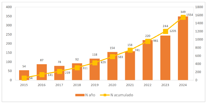 La Figura 2 refleja un crecimiento sostenido en la producción científica sobre creatividad universitaria. La producción comenzó con 54 documentos en 2015 y mostró un aumento progresivo hasta alcanzar un total acumulado de 1554 publicaciones en 2024. El crecimiento se acelera visiblemente a partir de 2020, con 158 documentos ese año, y se intensifica en 2022 con 220 publicaciones. El pico de producción anual se observa en 2024 con 349 documentos, mientras que el valor mínimo corresponde a 2015 con 54 publicaciones.