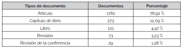 En la Tabla 1 se presenta la distribución de los tipos de documentos sobre creatividad universitaria indexados en Scopus. Se observó un predominio de artículos científicos, que representan el 78,92 % (n = 1782) del total. En segundo lugar se encuentran los capítulos de libro con el 12,09 % (n = 273), seguidos por los libros completos (4,47 %, n = 101). Las revisiones sistemáticas alcanzan el 3,23 % (n = 73), las cuales permiten sintetizar hallazgos previos y consolidar marcos teóricos. Finalmente, las revisiones de conferencia constituyen el 1,28 % (n = 29).