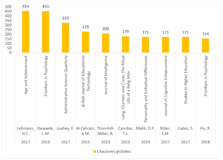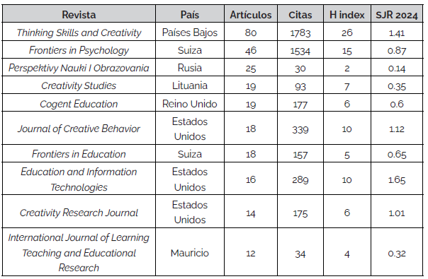La Tabla 4 presenta las revistas de mayor producción, se identificó en primer lugar, Thinking Skills and Creativity (Países Bajos), con un total de 80 artículos, 1783 citas y un índice h de 26. En segundo lugar se ubicó Frontiers in Psychology (Suiza), con 46 artículos, 1534 citas y un índice h de 15. Le siguió Perspektivy Nauki I Obrazovania (Rusia), con 25 artículos, 30 citas y un índice h de 2. Otras revistas destacadas, aunque con menor volumen de producción, incluyen a Creativity Studies, Cogent Education, Journal of Creative Behavior, Frontiers in Education, Education and Information Technologies, Creativity Research Journal e International Journal of Learning, Teaching and Educational Research.