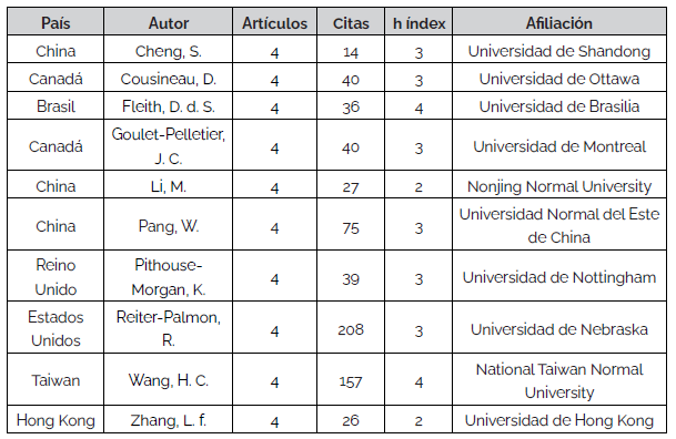 La Tabla 3 presenta a los 10 autores con mayor producción e impacto en estudios sobre creatividad universitaria, seleccionados entre un total de 160 investigadores. El autor con mayor número de citas fue Reiter-Palmon, R. (Estados Unidos), con 208 citas y un índice h de 3. Le siguen Wang, H. C. (Taiwán), con 157 citas y un índice h de 4, y Pang, W. (China), con 75 citas y un índice h de 3. En América, se identificaron a Cousineau, D. y a Goulet-Pelletier, J. C. (Canadá), ambos con 40 citas y un índice h de 3, y a Fleith, D. d. S. (Brasil), con 36 citas y un índice h de 4. En Europa, figura Pithouse-Morgan, K. (Reino Unido), con 39 citas y un índice h de 3. Finalmente, Zhang, L. F. (Hong Kong) y Li, M. (China) registraron 26 y 27 citas, respectivamente, con un índice h de 2 en ambos casos.