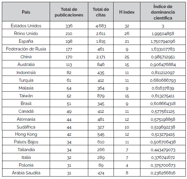 Los países con mayor producción fueron Estados Unidos, Reino Unido y España, con niveles altos de citación e impacto (h index > 20), como se visualiza en la Tabla 2. Predomina la participación del norte global, mientras que países del sur global aparecen con menor presencia y conectividad.