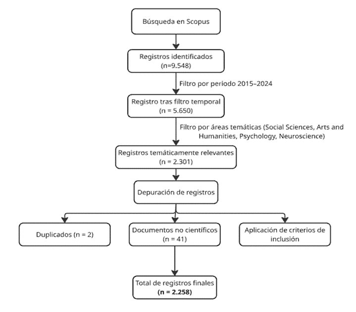 Durante la fase de selección documental, se aplicó el protocolo PRISMA 2020 (Page et al., 2021), que estructura el proceso en cuatro etapas: identificación, cribado, elegibilidad e inclusión. En la primera fase se recuperaron 9548 documentos iniciales; tras eliminar duplicados y aplicar los filtros temporales (2015–2024), temáticos (ciencias sociales, humanidades, psicología y neurociencia) y metodológicos, el conjunto final quedó conformado por 2258 documentos válidos, conforme se resume en la Figura 1 (diagrama PRISMA).