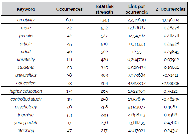La Tabla 6 muestra las 15 palabras clave con mayor fuerza de conexión semántica (total link strength) en los estudios sobre creatividad universitaria. Tal como se esperaba, el término creativity encabeza el listado con 601 ocurrencias y un total de 1343 enlaces, consolidándose como el nodo central del campo. Su índice de conectividad por aparición (2,23) refleja una articulación semántica dominante, lo que confirma su rol estructural como eje temático transversal a las distintas líneas de investigación.