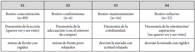 Entre la adecuación del rostro-conformismo y la espontaneidad del rostro-mantenimiento se genera un discurso que no está concentrado en la aspiracionalidad proyectada en el rostro-esfuerzo, ni en la determinación hacia la compra del rostro-concentración. No obstante, la presencia de un discurso de cotidianidad habilitado por el conformismo y el mantenimiento es aún menor (Tabla 2).