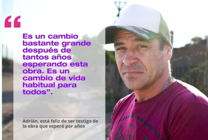 La Imagen 3 muestra el rostro de Marcelo Cáceres, vecino del barrio, quien se constituye en punto de atención fotográfica. Al igual que en las dos imágenes anteriores, el fondo aparece difuminado, borroneando el escenario que enmarca las prácticas y las formas de habitabilidad construidas en el espacio. Lo relevante es el rostro fijado, que no sonríe ante la cámara y queda registrado para su reproducción automática. Allí también se destaca un fragmento de cita que habla por Cáceres sobre los avances de las obras de urbanización desplegadas por el gobierno. El testimonio resulta más “elocuente” en tanto destaca aspectos que refieren a las condiciones de vida caracterizadas por la deficiencia de bienes y servicios básicos: “no tenía cloacas, hice un pozo al fondo, pero ahora ya voy a poder comprar los caños para conectarme a la cloaca”. El contraste entre la precariedad de la vida cotidiana y la promesa de urbanización como “transformación” se reproduce en cada fragmento de cita seleccionado estratégicamente por la prensa oficial.