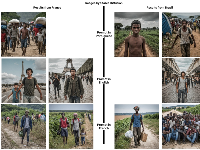 On the other hand, still in the field of stereotypes and given the broad, general formulation of the prompts, we observed the production of images that went beyond the objectives of what a “neutral” representation of a Brazilian migrant in France should be, since there was an apparent confusion between the meaning of migrant and refugee, as well as many images that ignored the French space.