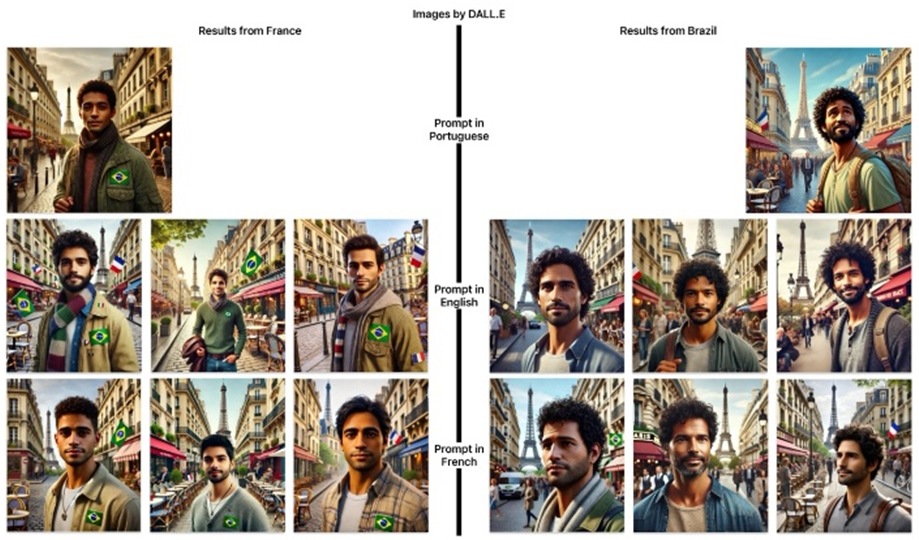 The same considerations can be made in relation to the images generated from the prompt entered in French in both Brazil and France.