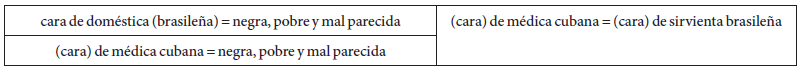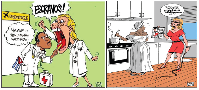 Pêcheux (1990) define el acontecimiento discursivo como el “punto de encuentro de una actualidad y una memoria” (p. 179). Es un elemento histórico discontinuo y externo que afecta a la memoria, produciendo rupturas y desplazamientos. Así, a través del funcionamiento de la memoria en el acontecimiento discursivo, los sentidos producidos repiten y desplazan al mismo tiempo lo ya dicho, produciendo una proyección y un retorno de los procesos discursivos sobre sí mismos, reconfigurando y desestabilizando la serie de repeticiones, dando lugar a nuevas interpretaciones. Consideramos la aprobación de la enmienda constitucional llamada “PEC das empregadas domésticas”v como un acontecimiento discursivo que afecta la red de memoria de los discursos de la esclavitud, de la colonización y de la democracia racial, dando lugar a nuevas posiciones discursivas y a desplazamientos ideológicos, tanto por parte del movimiento de mujeres negras y del movimiento sindical de las trabajadoras domésticas, como por parte de las entidades patronales masivamente representadas en los medios conservadores. La polémica en torno a la aprobación de la ley y su análisis ocuparía más espacio del que se dispone en este artículovi, sin embargo, la publicación de las declaraciones de la periodista brasileña Micheline Borges sobre las médicas cubanas que llegaron a Brasil nos ofrece en su materialidad discursiva compleja un objeto discursivo paradójico, cuyos equívocos y contradicciones condensan de manera emblemática la lucha social y política por el sentido.