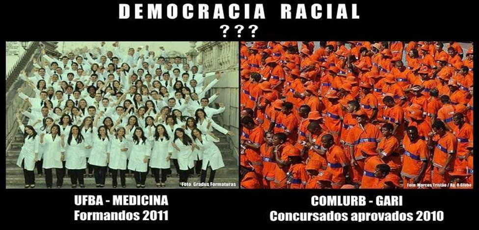 En el marco del discurso de la blanquitudxii, no se afirma que los médicos brasileños sean blancos, pero se denuncia que el programa Más Médicos contrate médicas cubanas que “no tienen buena apariencia” y que tienen “cara de sirvienta”, actualizando en el acontecimiento discursivo las prácticas racistas de reserva de vacantes en el mercado laboral brasileño, lo que contradice el imaginario dominante de Brasil como un país de democracia racial: para los blancos, la Facultad de Medicina (como en la foto de la graduación de la Universidad Federal de Bahía); para los negros, la profesión de barrendero (como en la foto de la derecha de las personas seleccionadas para trabajar en la Empresa Municipal de Limpieza Urbana de Río de Janeiro).